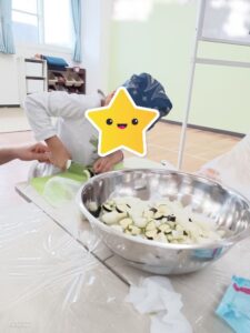 と嫌いが故にとっても小さくナスを切っている子も(^▽^;)
