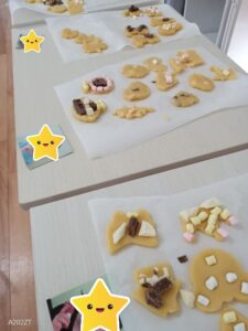 トッピングの材料にはチョコレート、ホワイトチョコレート、マシュマロが用意されており、可愛くて美味しそうなクッキーが沢山完成しました💕